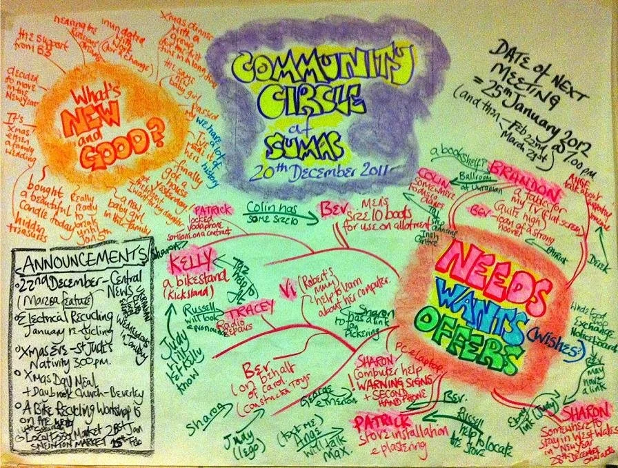 The purpose of community circles is to bring people from a local community together to share their skills, talents, gifts and resources. This idea is based upon the premise that ALL of us need three things in our lives to make us happy and fulfilled: these are money, friendship and meaning. We believe that everyone needs community, everyone needs to be heard and everyone needs to have fun.