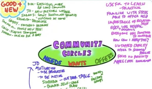 A community circle is made up of participants and allies from the local community. The meeting starts with everyone sharing food and conversations. Next the group comes together in a circle so that everyone can see each other and shares what is good and new in their lives, everyone gets a turn to be listened to. ‘New and Good’ breaks the habit of thinking about and acting from what’s wrong, it is an exercise of giving and receiving attention with one another and it also provides a strong foundation of strengths from which we can think about and tackle difficulties. The group is then asked the question what do they want, need or have to offer.
